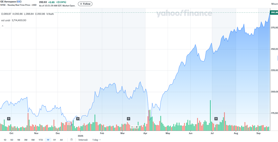 GE Aerospace shares reached an all-time high in September 2025, trading above $290 per share, surpassing the previous record set in 2000. The growth is mainly driven by strong demand for commercial aircraft engines and related services. In addition, the company has increased its full-year profitability estimate, further boosting investor confidence.