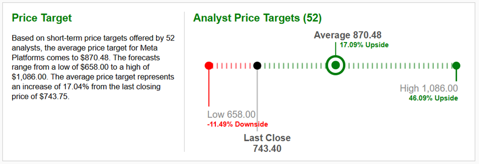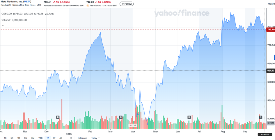 As of September 30, 2025, Meta Platforms Inc (META) shares are trading at around $743.4, representing a negligible daily decline of 0.11%. Market capitalization is approximately $1.86 trillion, with a P/E ratio of 25.95.