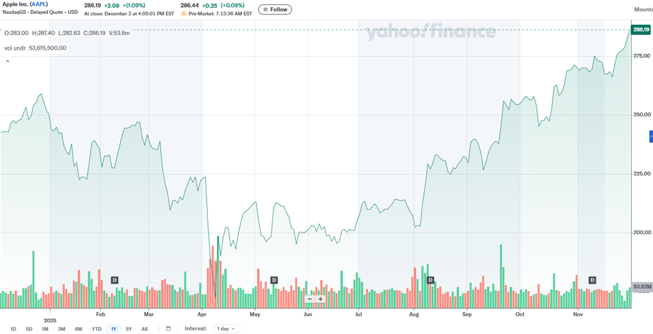 Apple shares show stable growth during the second half of 2025.
