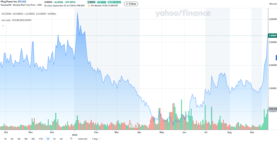 Plug Power, Inc. (PLUG), an American company focused on the production and distribution of hydrogen technologies, remains one of the most talked-about stocks in the renewable energy sector in 2025. Although the company continues to report high losses, its shares have risen significantly in recent weeks. This development reflects a combination of technological advances, regulatory support, and increased investor interest in hydrogen technologies.