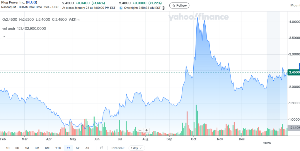 At the end of January 2026, Plug Power shares are trading at around USD 2.4 per share. The stock remains highly volatile and has experienced sharp price fluctuations in recent months.