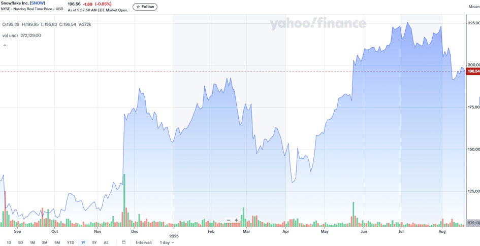 In 2025, Snowflake Inc. is undergoing a significant transformation that reflects both the dynamic development of cloud data platforms and growing competitive pressure. The company’s shares are currently trading at around USD 198 (as of August 19, 2025), representing an increase of approximately 26% since the beginning of the year.