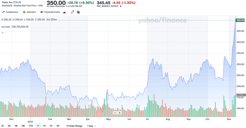 Shares of Tesla, Inc (NASDAQ:TSLA) continue to rise, thanks largely to the Musk-Trump alliance, which is gaining strength and boosting earnings. Tesla shares opened a new chapter in last week’s rally with a Monday jump of over 8.96%, which was fueled by the automaker’s bets benefiting from CEO Elon Musk’s close relationship with U.S. President-elect Donald Trump. At $350 a share, Tesla is expected to add nearly $87 billion to its value if profits hold. Since Trump’s election victory was announced last Wednesday, the stock has jumped nearly 28%, surpassing the $1 trillion market value for the first time in two years.