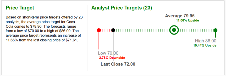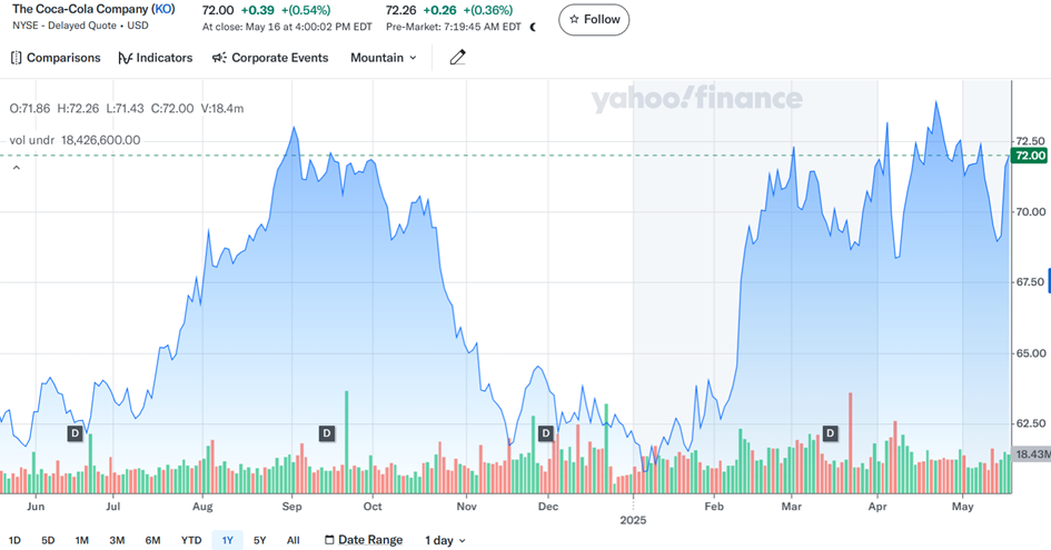As of May 16, 2025, the market price of Coca-Cola stock was $72.00, an increase of approximately 15% since the beginning of the calendar year when the price was around $62.26. This growth reflects not only investor confidence but also solid fundamental performance. Some analyst models are forecasting further appreciation of up to 4-5% over the next six months.