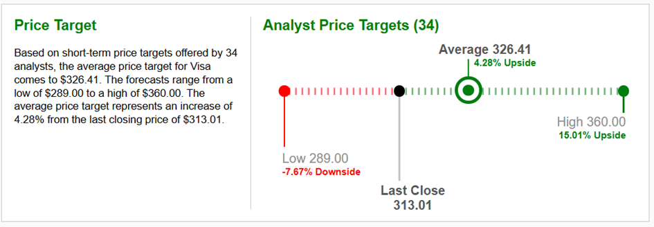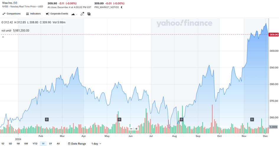 Shares of Visa are currently trading around $309, close to their one-year high. Despite strong financial results, the stock has seen a slight decline, which may be due to investor concerns over ambitious expectations of double-digit revenue growth on an adjusted constant dollar basis in 2025.