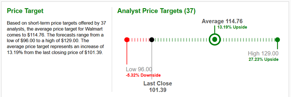 The company also pays regular quarterly dividends. The dividend yield is currently USD 0.24 per share. The dividend amount itself was approved by the company’s general meeting at 0.93% p.a. Walmart Inc. also currently has a known date for the payment of its quarterly dividend, namely the Pay Date, which will be January 5, 2026. The last day to purchase shares using the dividend, i.e., the Ex-Dividend Date, will be December 12, 2025. The average target price was set by 37 analysts at zacks.com for a short- to medium-term investment horizon at USD 114.76 per share.