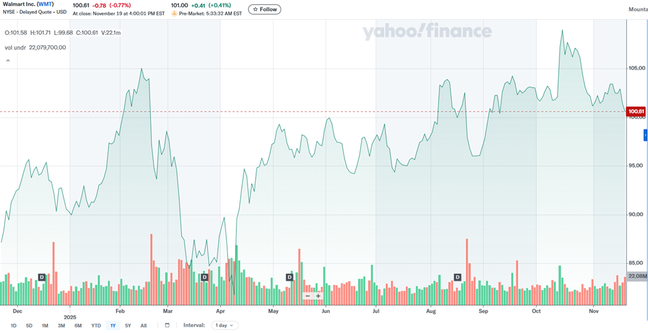 Walmart’s share price is hovering around USD 100. After strong growth in previous months, there was a partial correction after the company announced a decline in its operating margin. Investors are currently assessing the extent to which future profits will be affected by rising costs and whether the planned technological transformation will deliver the expected results.